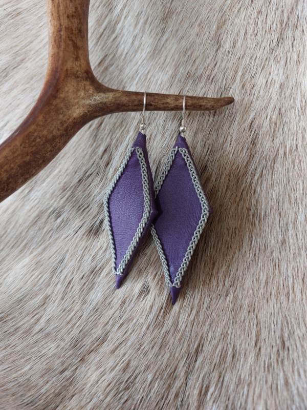 Handgemaakte oorbellen met zilver-tindraad en rendierleer, hier afgebeeld in paars.